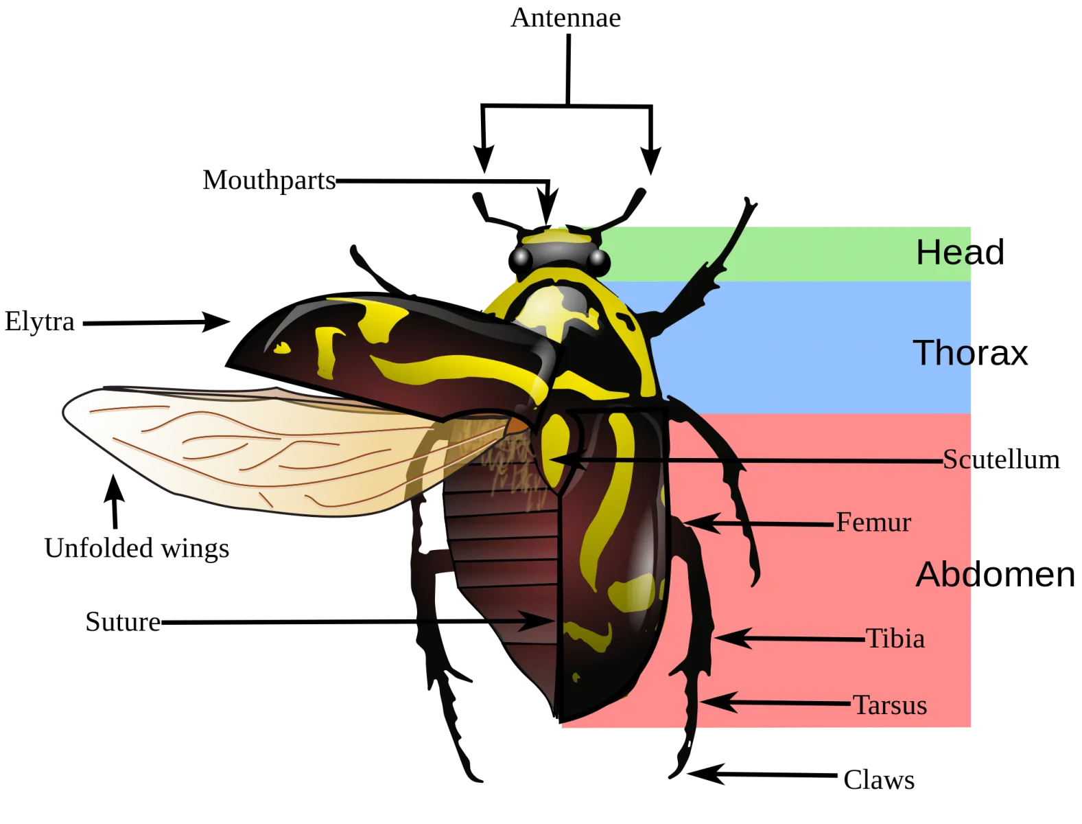 Insects are small air-breathing arthropods (such as ants, beetles, butterflies, bees) with a three-part body (head, thorax and abdomen), three pairs of jointed legs, typically one or two pairs of wings, compound eyes and two antennae.
