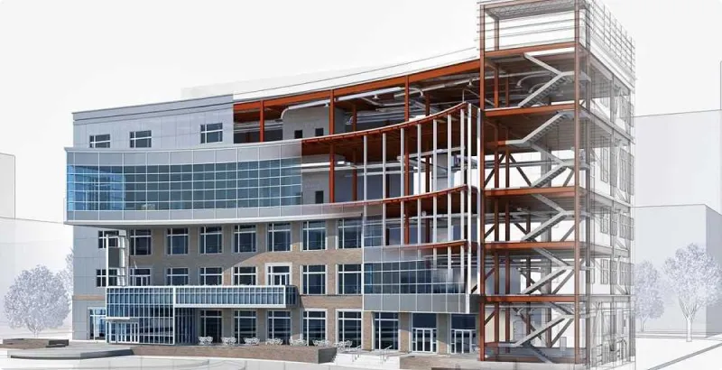 The construction team will excavate the site; create the foundation of the building; erect the support framework (skeleton, also called the superstructure) around which the building will be built (usually reinforced concrete and/or steel sections); build the structure, one floor at a time (out of brick or other materials) and install pipes and cables for plumbing and electrical services and IT networks.